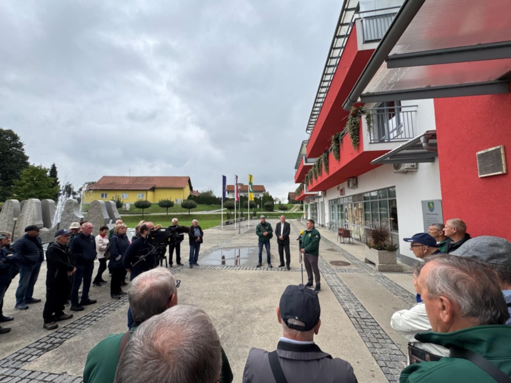Zbrali smo se pred Občino Hajdina kjer nas je pozdravil župan mag. Stanislav Glažar in nam zaželel dobrodošlico in ponos ob tem, da smo za letno srečanje izbrali prav Občino Hajdina.